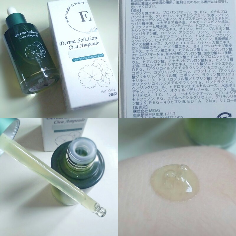 ツボクサ葉エキスが49%も配合されているからか、美容液はとろみがあり、緑っぽい色をしています。香りも多少ありますが、私は気にならないかな。