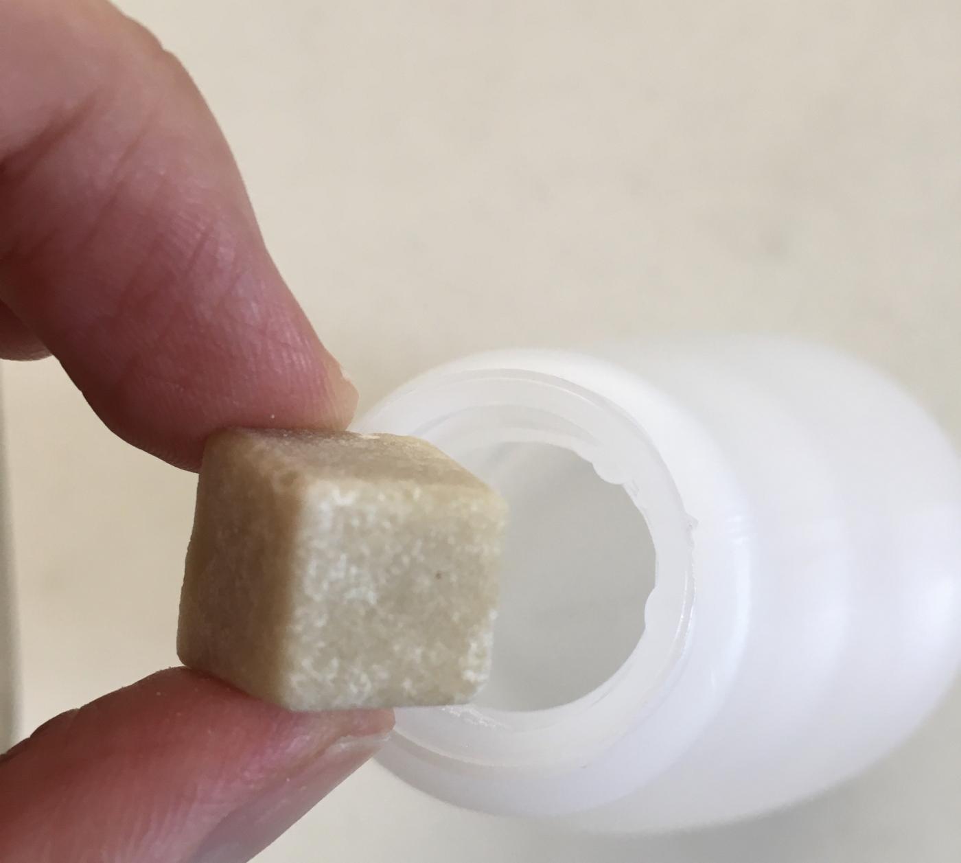 この四角いキューブをお湯に溶かしてスプレーすると、水垢・カビ・油汚れがピッカピカになるんです!!