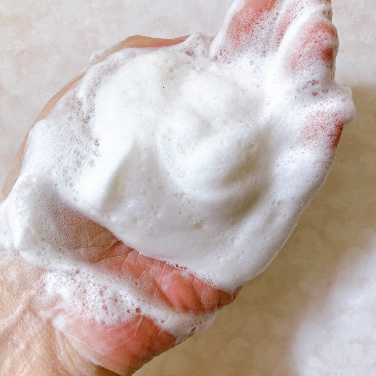 一緒に着いていた泡立てネットを使い泡を立てるとすぐにモコモコともっちりとしたキメの細かい濃密な泡ができました♪