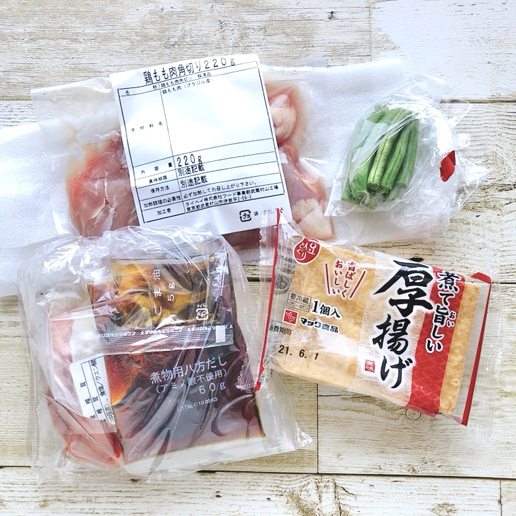角切りになった鶏もも肉、タケノコとニンジンの水煮ミックス、水煮しいたけ、カット済みのインゲン、厚揚げ、煮物用八方だし、ごま油の7点セット♪