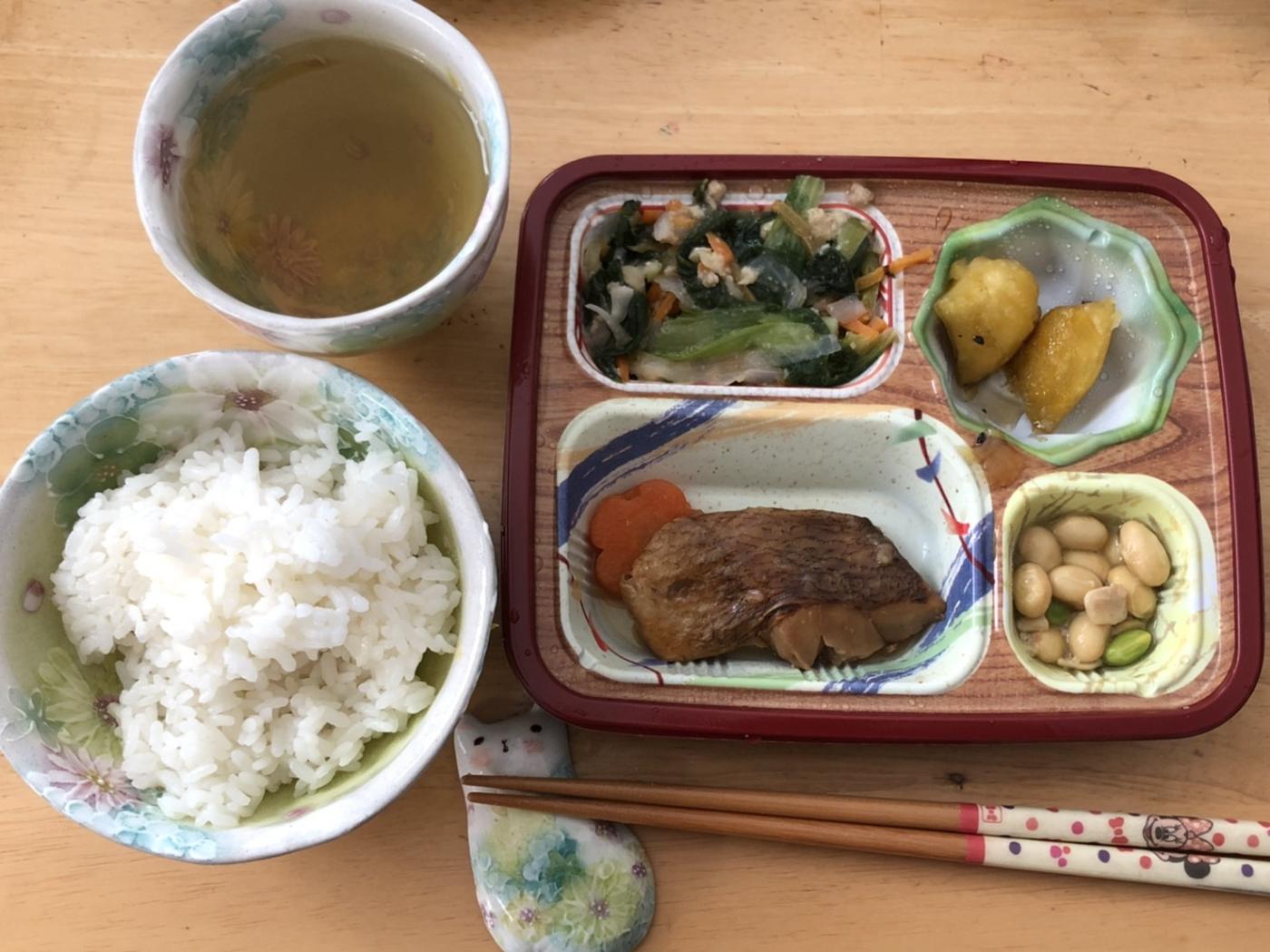 写真の赤魚の煮付けのセット(青梗菜の炒め物、大学芋、枝豆と大豆のペペロンチーノ風)は、