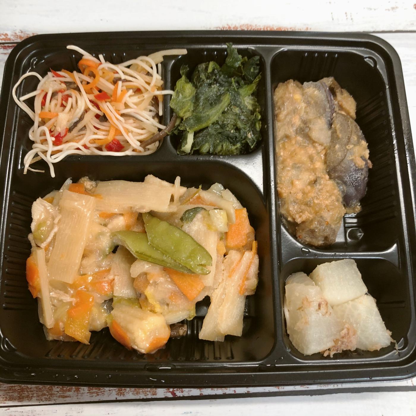 鶏肉が少し入っていてあとは葉物のおかずが多く、きんぴらと蓮根の食感が楽しめました🌟
