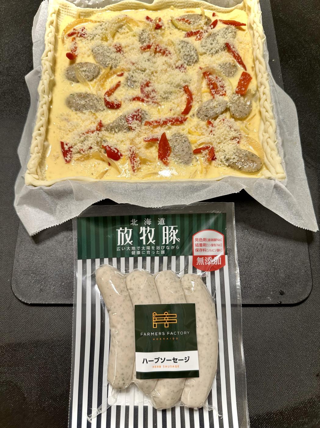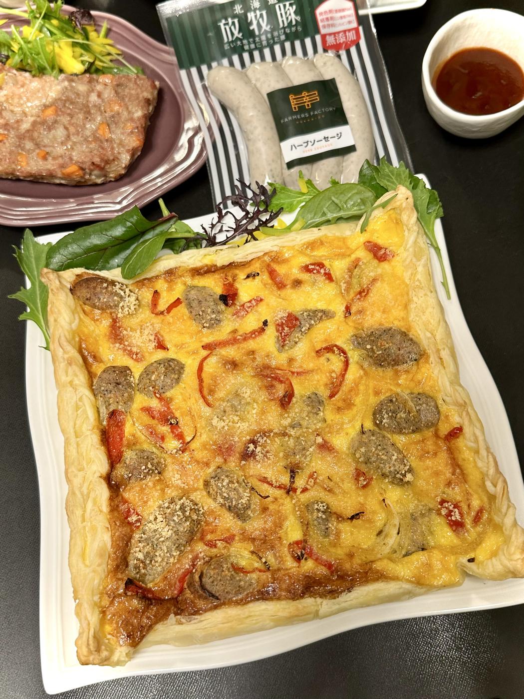加熱に強そうなので、お肉ゴロゴロのキッシュに仕立てました。どこを食べてもソーセージがあるので、食べて楽しいプレートに。