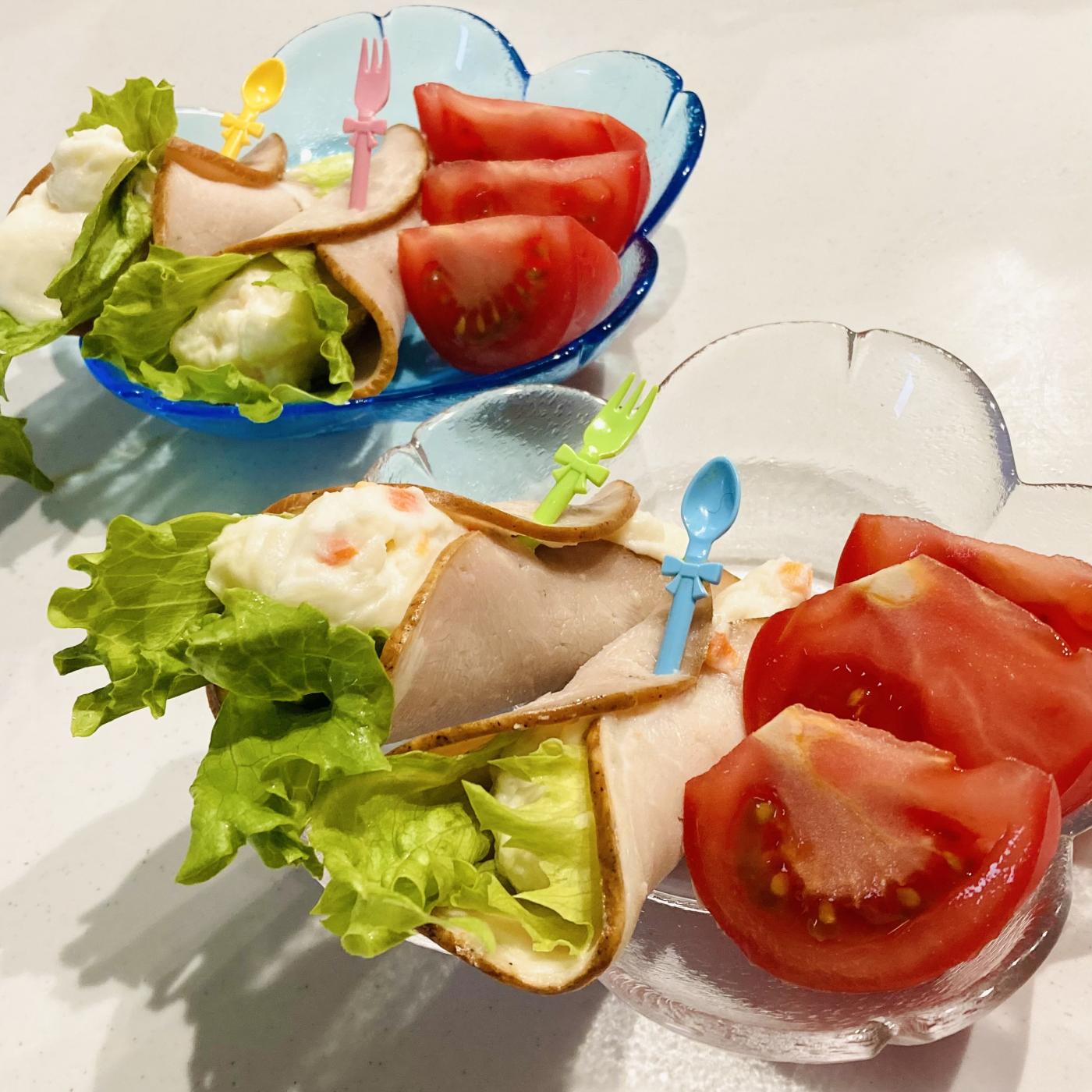 作り方は、ハムにレタスとポテトサラダを乗っけてクルッと巻いて、ピックでとまるだけ❗️