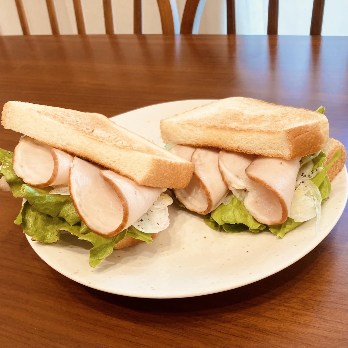 食パンにたっぷりのレタス&スライスオニオンと放牧豚ロースハムを挟んで、マヨネーズ・ブラックペッパー・マスタードで味付けしました。