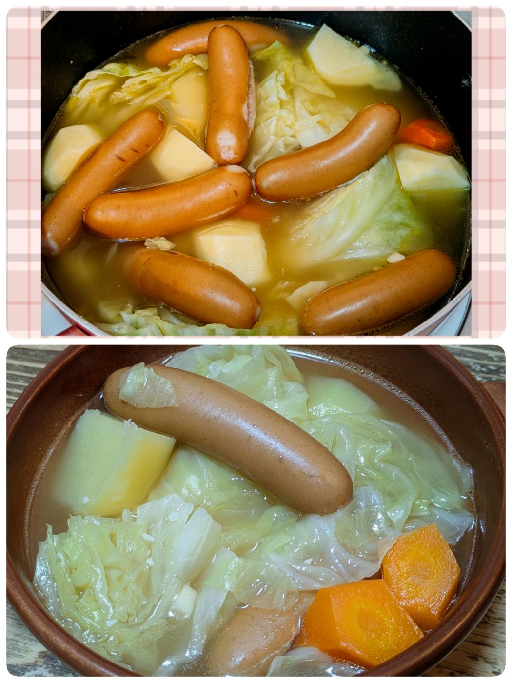 最初に野菜と一緒に煮込んでしまったので、少しソーセージが割れてしまっていますが、そこは気にせず。