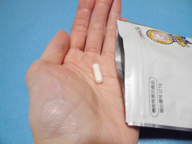 白っぽいパウダーが入ったカプセルで、サイズがちょうど良く飲みやすいと感じました。1日に飲む量も1粒で良いので、手軽に続けやすいと思います。