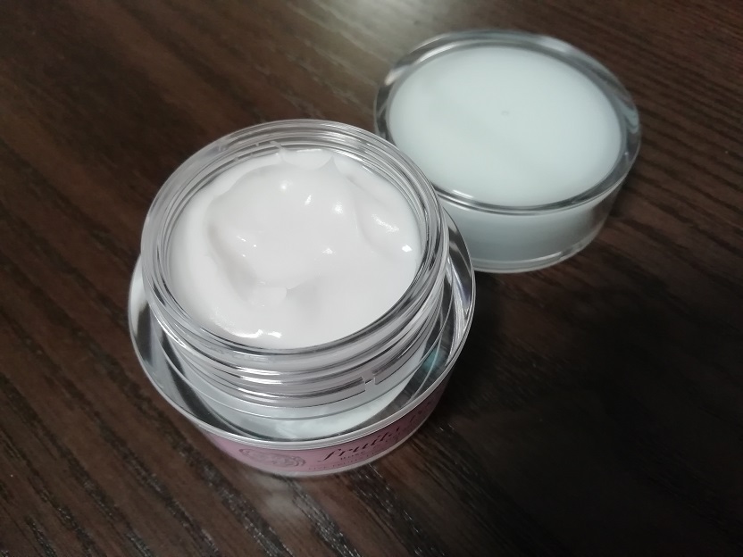 小ぶりなジャータイプ。 ガラス製で高級感のある外観です。 薄いピンク色のクリームが透けて見えてい...