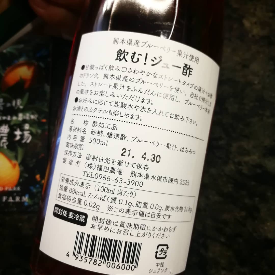 熊本県産ブルーベリーを使ったフルーツビネガードリンクを60周年記念を迎える福岡県水俣市にある福田農場株式会社さまよりいただきました。