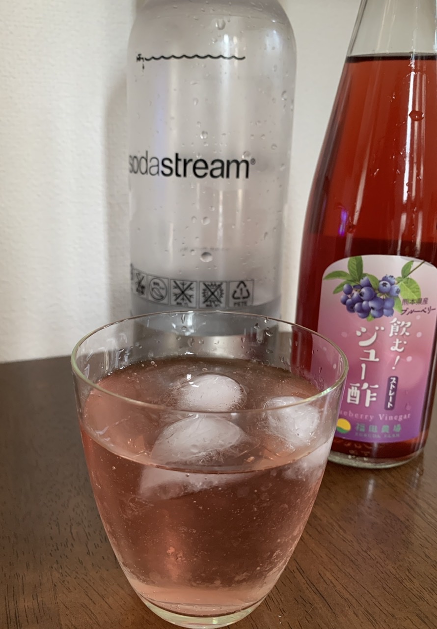 甘酸っぱく飲み口さわやかなストレートタイプの果汁+お酢のドリンクであるこちら、炭酸水や氷を入れても楽しめるとのことで、ワタシは自家製ソーダストリームで作った炭酸水で割っていただきました。