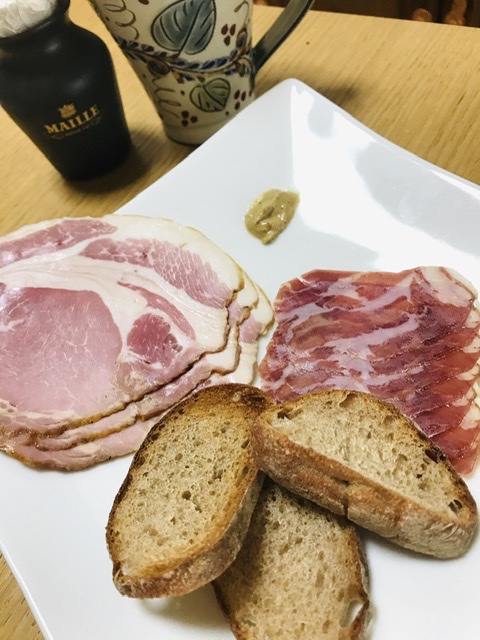 トンネル熟成という言葉も初めて知りましたが、ハム、サラミ、ベーコンは総じて脂の旨味がしっかりしていて、口の中の熱でトロッと溶けていくのに、しつこい塩味もしょっぱさも全くありませんでした。薄いのに、食べ応えもしっかりしており、美味しいハムとはなにかを考えさせられました。ハムの主張が強すぎないから、トリュフマスタードや胡椒を合わせたり、アレンジもいろいろ楽しめました。焼いたベーコンは優しい味で、食パン、バゲット、ライ麦パンなど、どんなパンも引き立つ脂の旨さ!もちろん、ワインにも良く合いました。