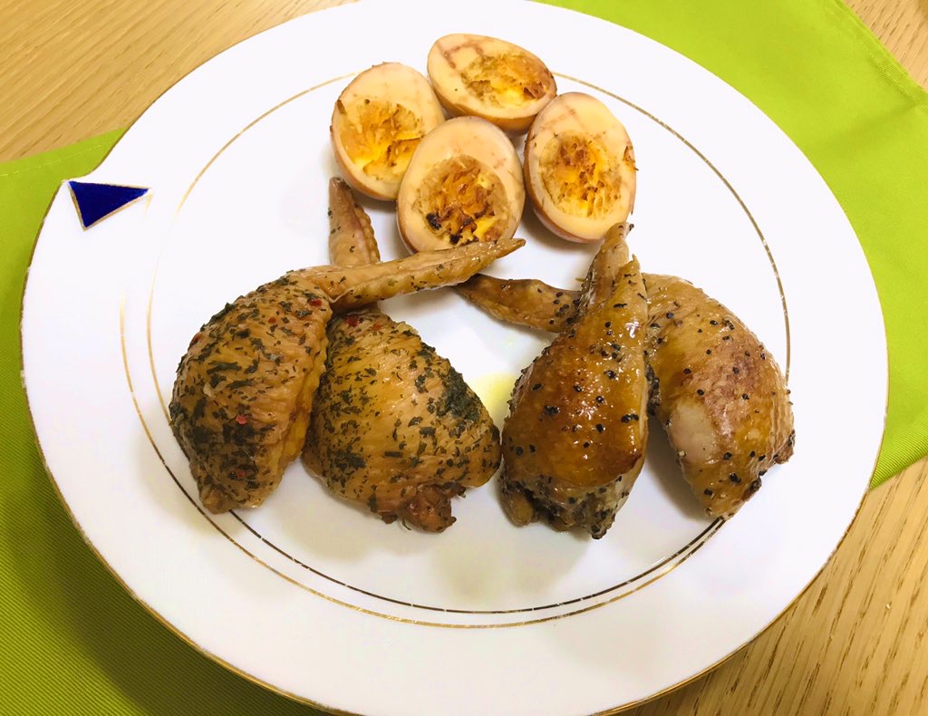 手羽ポケットンには感動!スモーキーな燻製の香りが手羽元をターキーのような深みにさせています。そして中のソーセージがまた柔らかいのに食べ応えがあり、チーズやレモン、カレーといったフレーバーの違いも楽しめて、ビールにも赤白ワインにも合い、とてもとても贅沢な晩酌の時間を過ごすことができました。燻製卵を自家製して、いただきました。