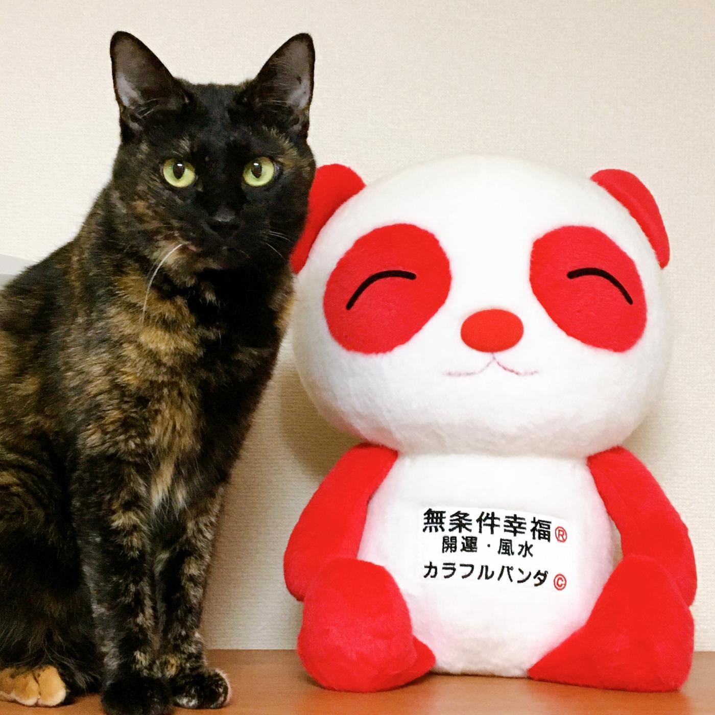 そして、面白いのは、我が家の福猫「サビ猫あーちゃん」がパンダさんの横にずっと座っています(笑)