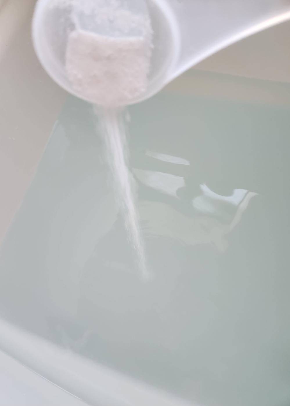 浴槽200リットルに対して温泉の素を付属のスプーンで1杯入れます