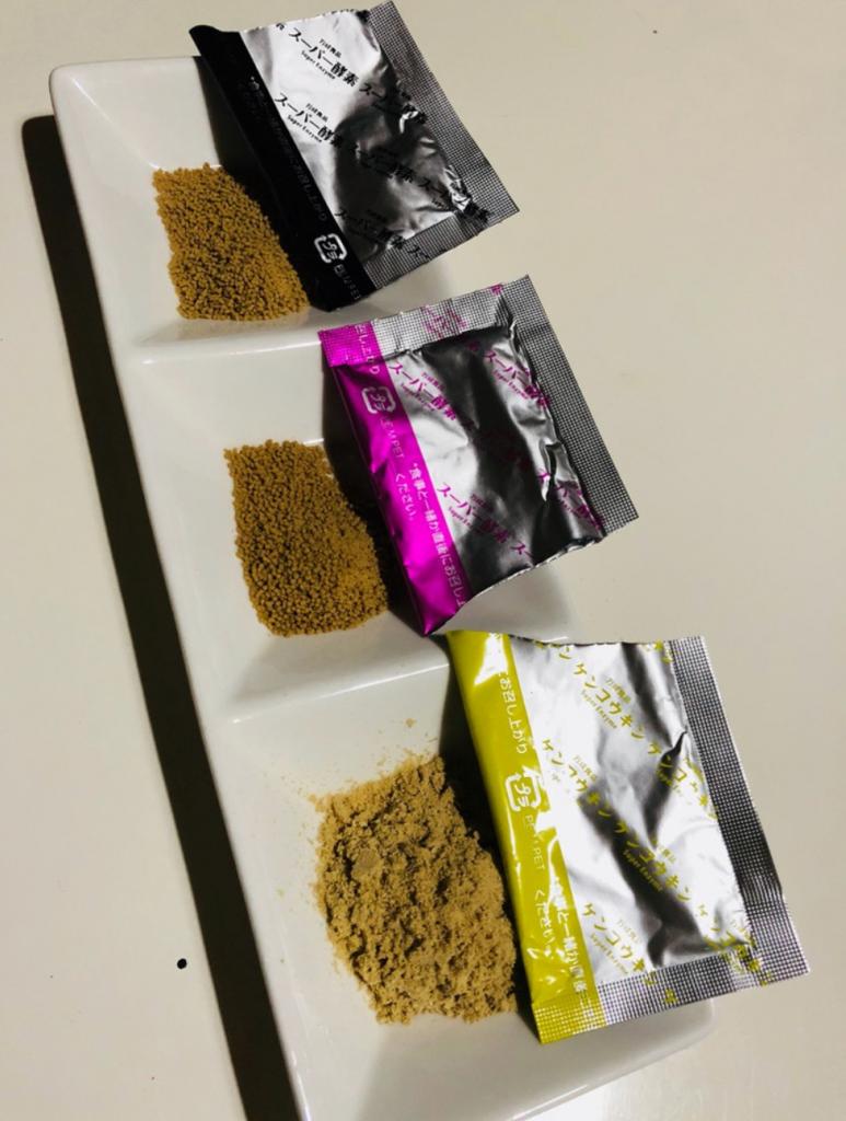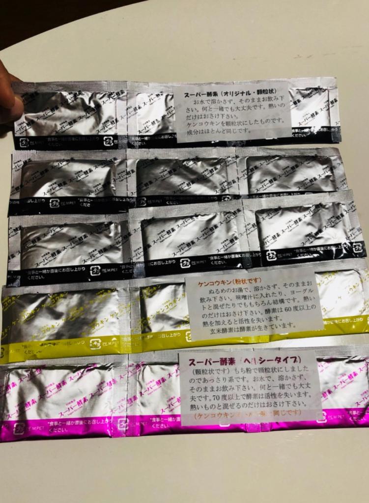2回目の5日分お試しです(^^) 黒→顆粒タイプのスーパー酵素オリジナル 黄色→コナ状のケンコウキン ピ...