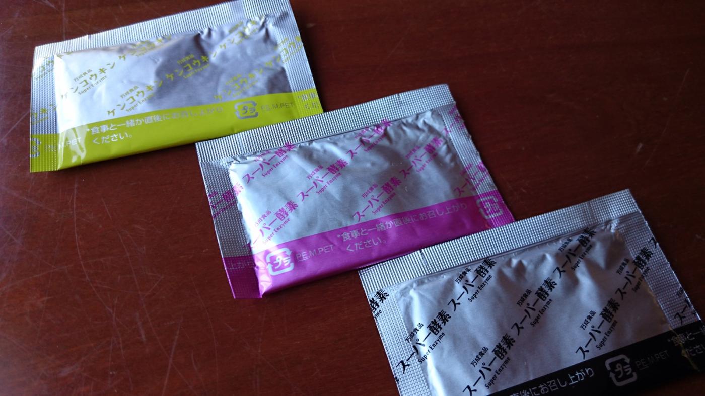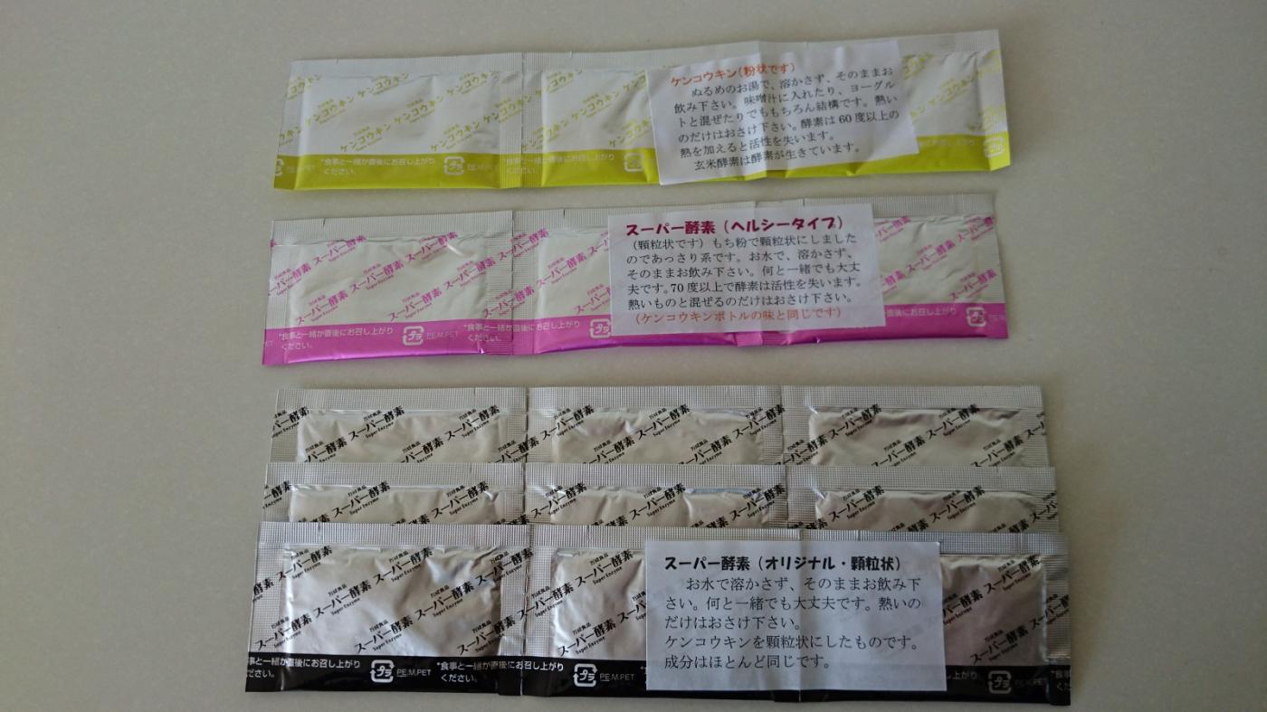 「ケンコウキン」が黄色、「スーパー酵素 ヘルシータイプ」がピンク、「スーパー酵素 オリジナル」が黒です。