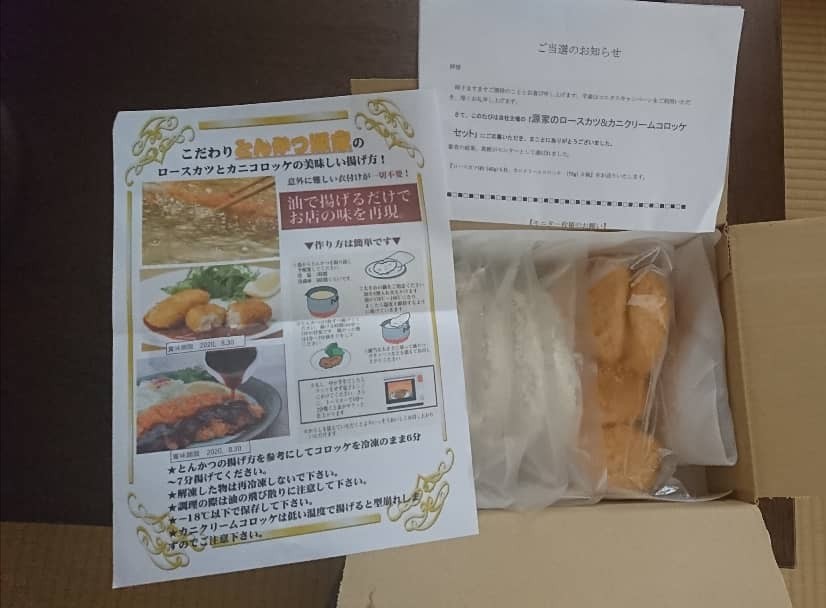 段ボールにはご当選お知らせ用紙&冷凍のロースカツ 5枚&カニクリームコロッケ セット5個