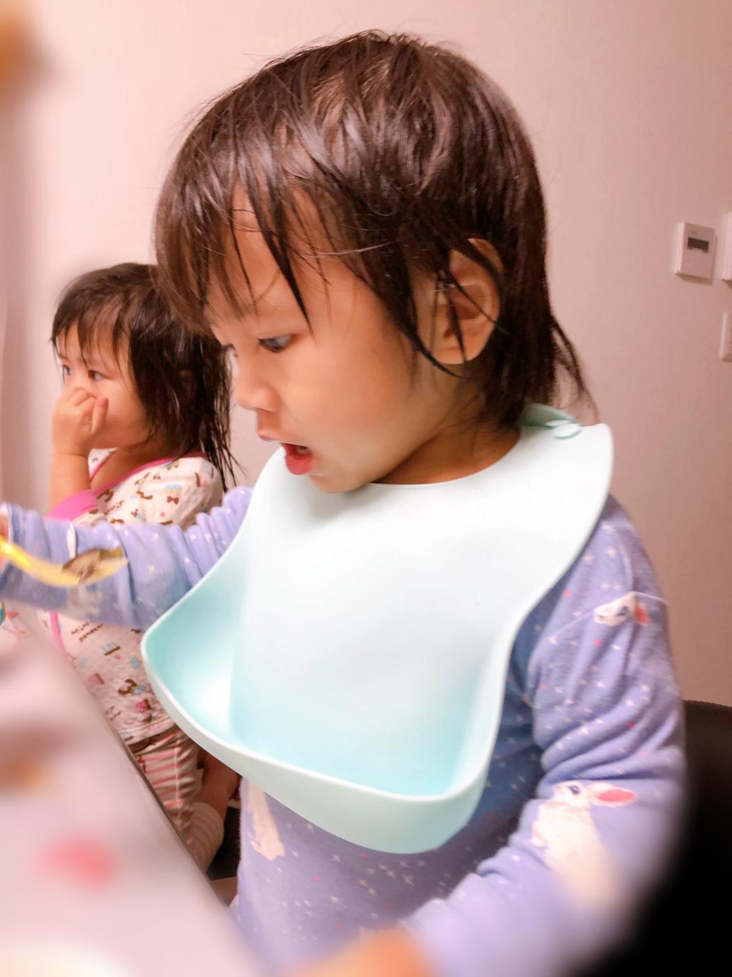 自分で食べてくれるのはとてもありがたいことですが、実は胸元や床に食べ物が…( ; ; )