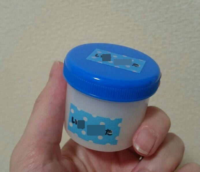 丸い容器に押せないのでマスキングテープにハンコを押して容器にペタ