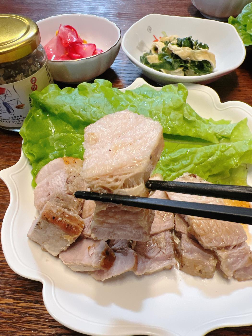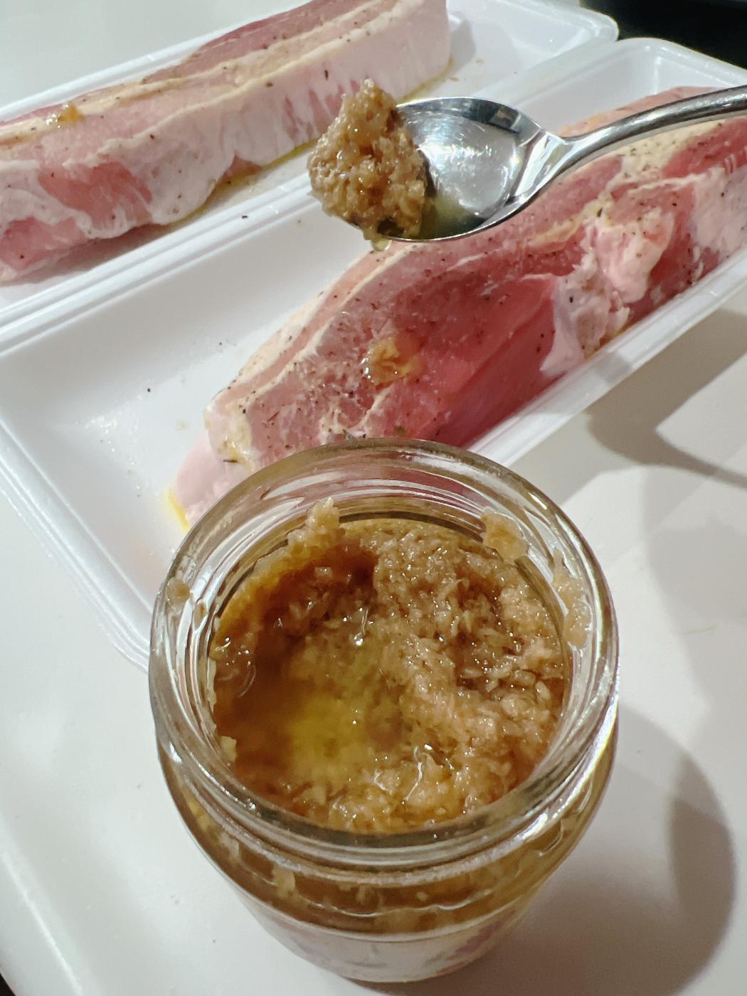豚バラ肉に塩胡椒とサムスイジンジャーソースを塗りこんで一日中漬け込んで、200度のオーブンで焼き上げて作るサムギョプサルを作ってみました。