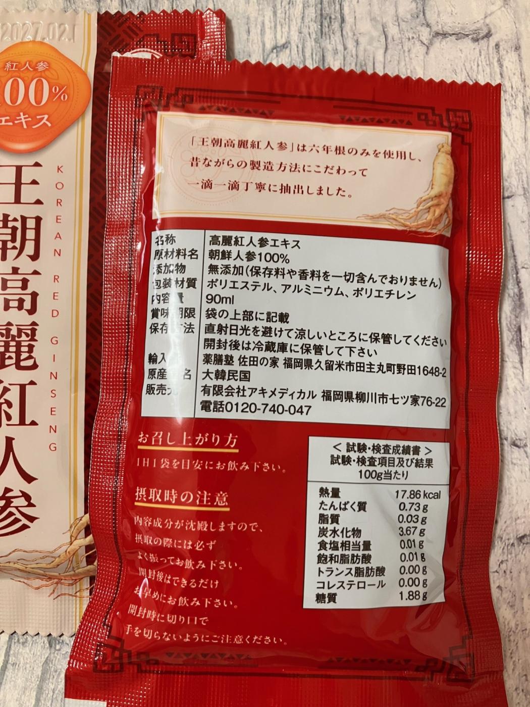 一袋に90ml入っています。底に沈殿物がたまりやすいということでよく振ってから飲むこと。就寝前が飲用のお勧めのタイミング(でもいつでも良いそうですが)だそうです。底に残っているのももったいないので水で少しすすいで飲むのもお勧めなのだそう。そのくらい貴重な高麗人参が使われて作られている製品です。