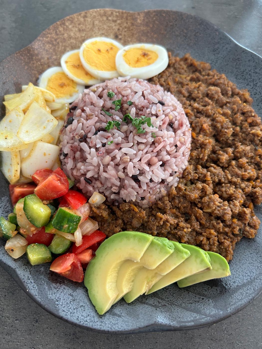 雑穀米、ゆで卵、アボカド、アチャール風サラダを添えて、彩りも栄養も満点に仕上げてみました🥚🥑🍅
