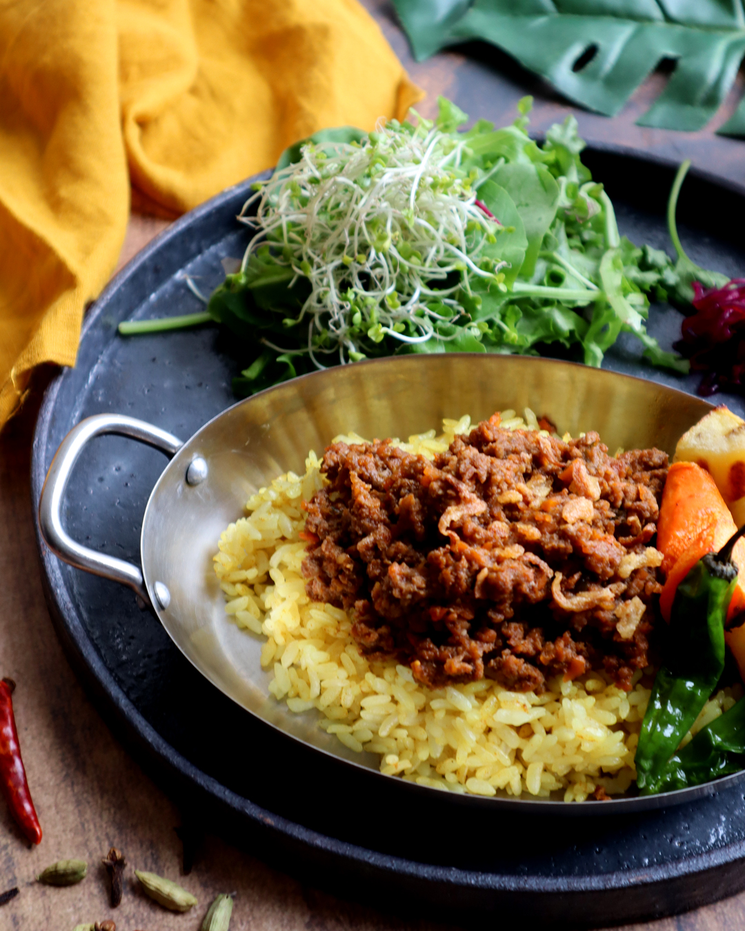 この薬膳キーマカレーは、竜眼肉・クコの実・甘草・ハスの実・陳皮など、薬膳として知られる素材を含めた25種類以上のスパイスと生薬がブレンドされているそうです。