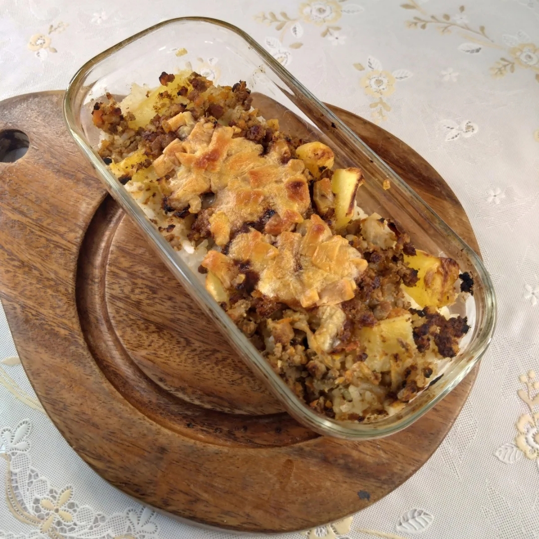 余ったカレーを、コンソメスープと牛乳で伸ばし、コンソメの具にしたジャガイモと玉ねぎを乗せてドリアにしてみました。(焦がしたけど😅)