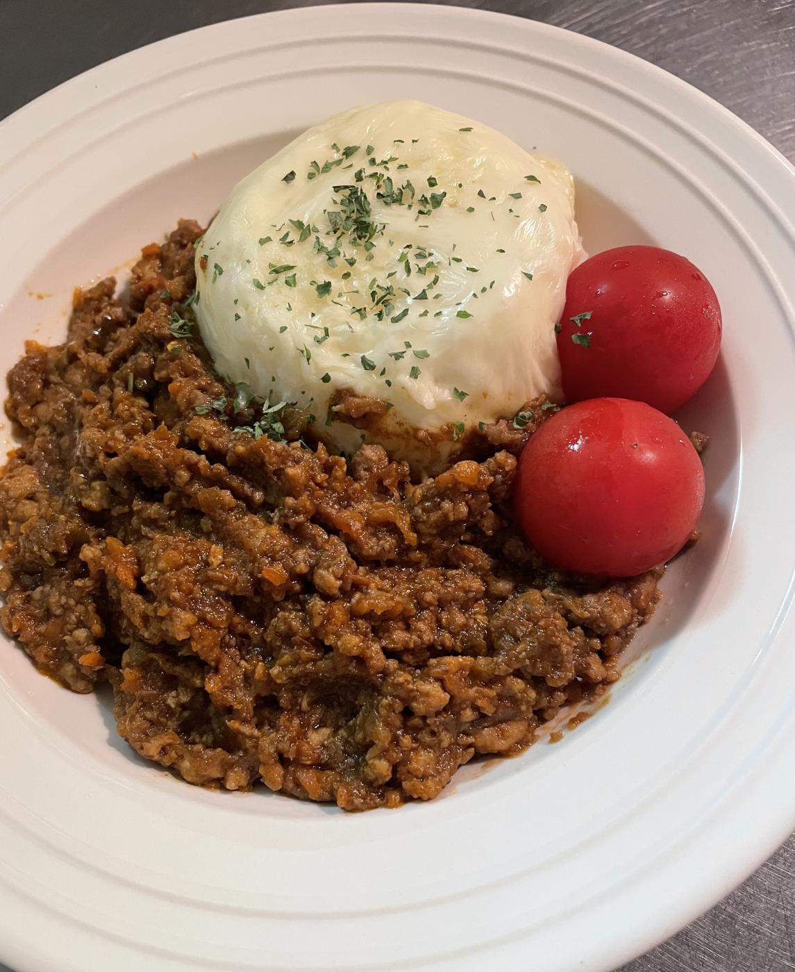 Instagramでみたら、ご飯にチーズソースをかけているのを載せている方がいたので、少し真似してご飯にチーズをのせて溶かしてカレーを入れてプチトマトを添えてみました♪