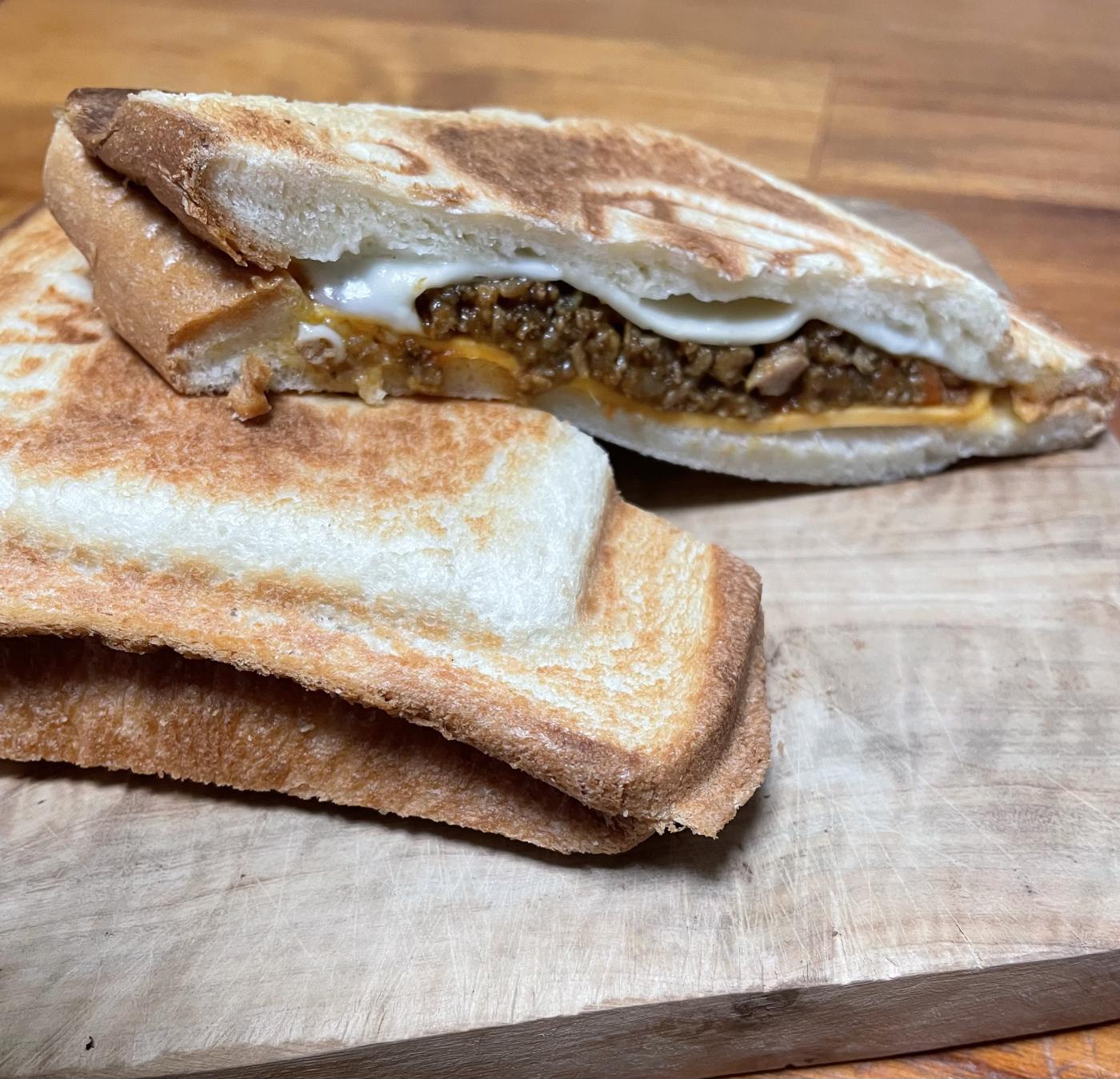 一袋で1食なのかな?私には少し多く感じたので、余ったキーマカレーをチーズと挟んで