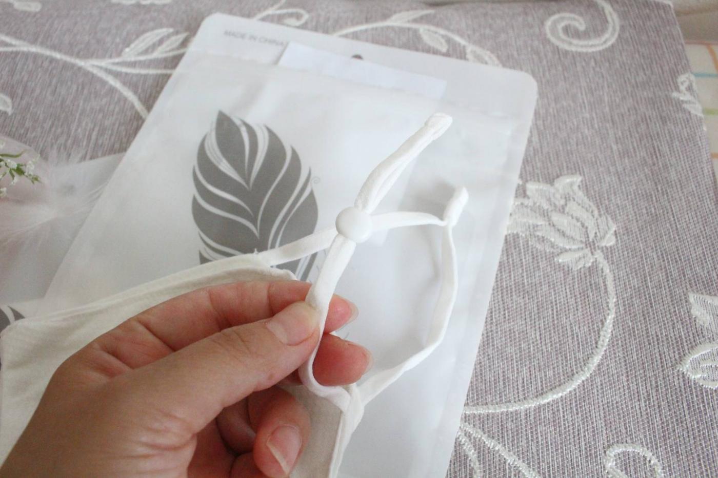 耳のゴムが少し長めに作られていて、サイズ調整で止められる柔らかいシリコン素材の留め具が付いています。