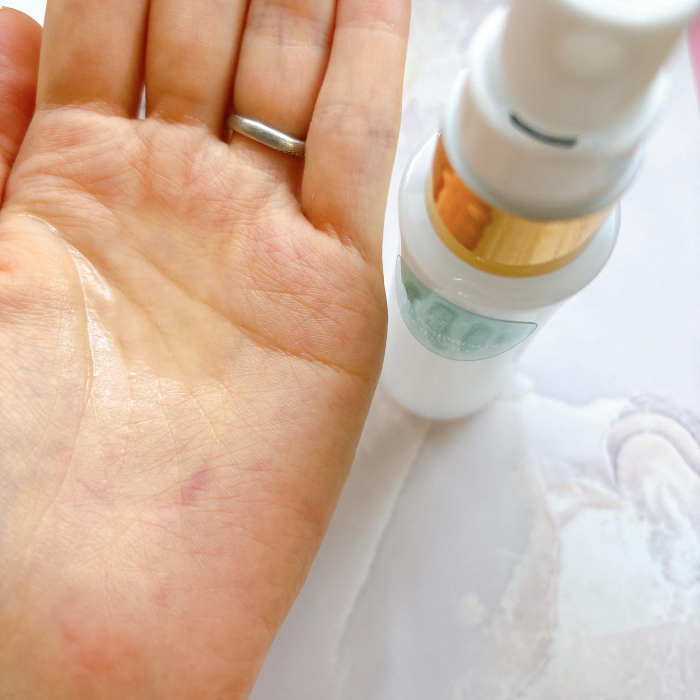 毎日使いやすいテクスチャーで、手のひらに1〜2プッシュ出すと、しっとり感があるのにのに驚くほどみずみずしい化粧水が広がります。肌にのばすと、軽やかな感覚で、べたつきを感じさせません。肌の中心から優しくプレスしてなじませて使っています。