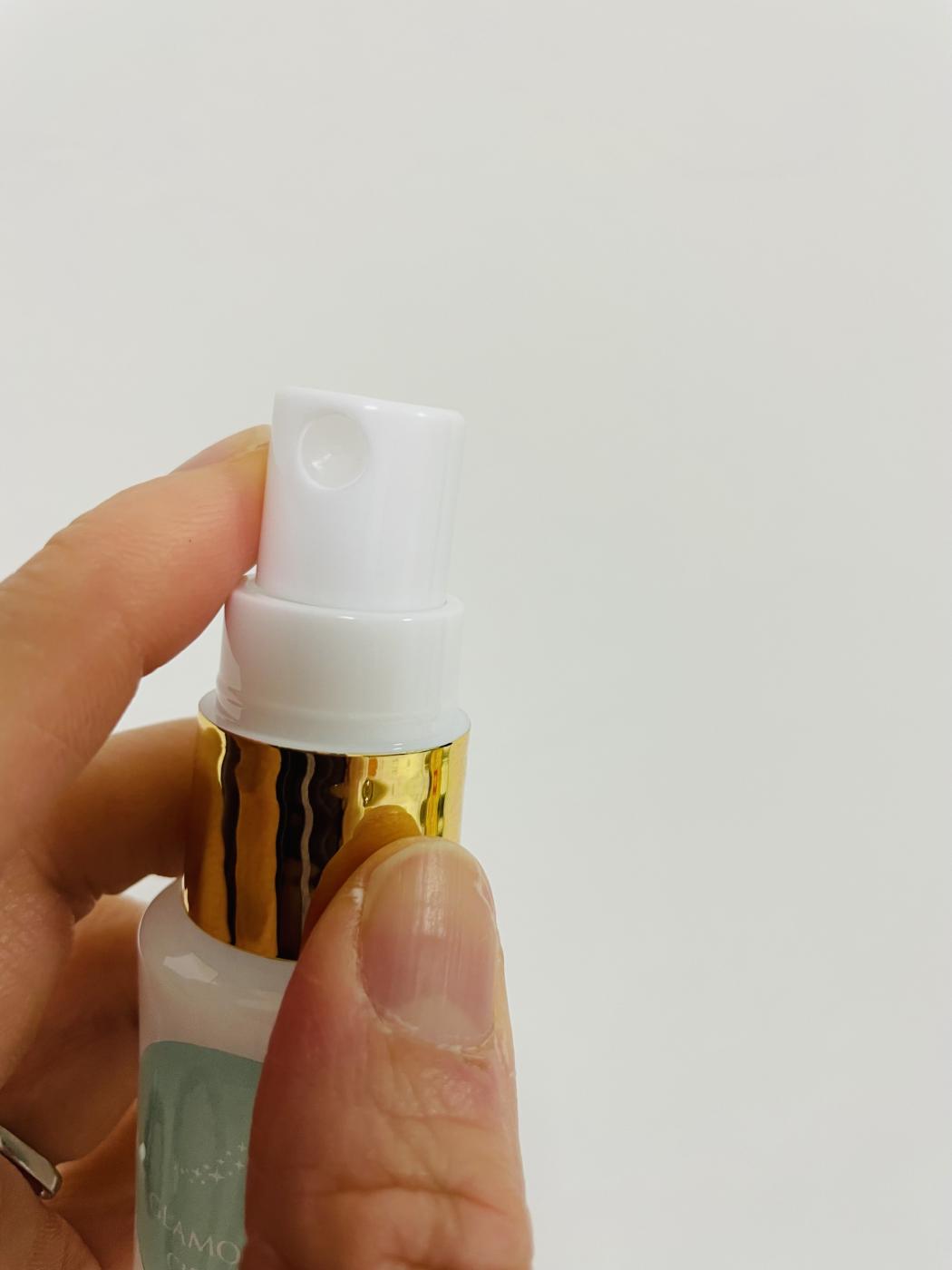 こちらのボトルはスプレーボトルになっています。手のひらに1~2プッシュ出してみると、さっぱりとしたテクスチャーでした。でも、肌にプッシュしていくと、しっとりとした感じがしました。手のひらに出すのがベストですが、どうしても時間が無いときは直接顔にスプレーして手のひらでプッシュしています。大変な時の心強い味方です。