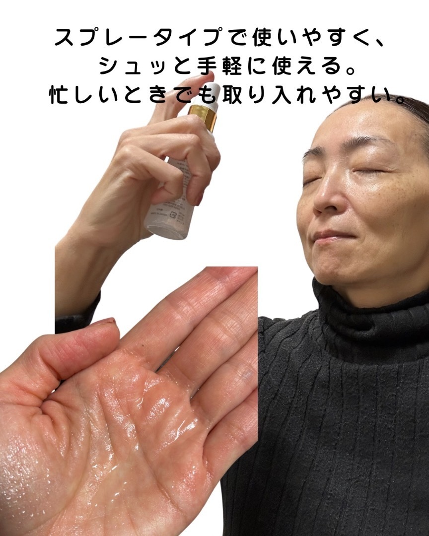 スプレータイプでシュッと使えるため、スキンケアの工程を増やしすぎたくない方や、時間がないときのケアにも取り入れやすいと感じました。毎日のケアに無理なく取り入れやすい、使い勝手の良さが印象に残るアイテムです。