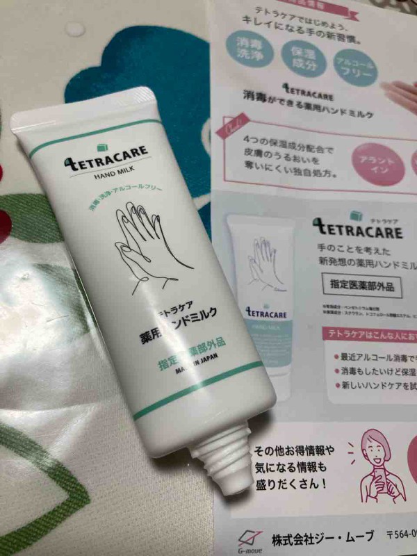 こちらテトラケアの薬用ハンドミルクは消毒もしつつ、手を保湿もしてくれるダブル効果て嬉しいハンドクリーム!