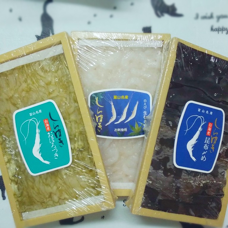 五本水産株式会社さんの白えび3種セット食べてみました。白えびの、むき身、昆布〆、おぼろづきの3種類です。