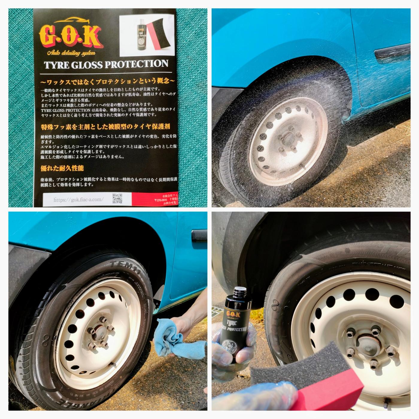 手軽な施工で耐候性と防汚性の優れたフッ素をベースとした被膜がタイヤの変色、劣化を防いでくれるので嬉しいです。