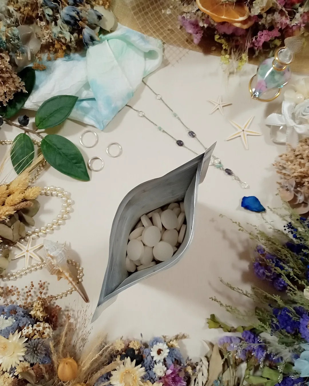 丸くて平たい白色のタブレット。