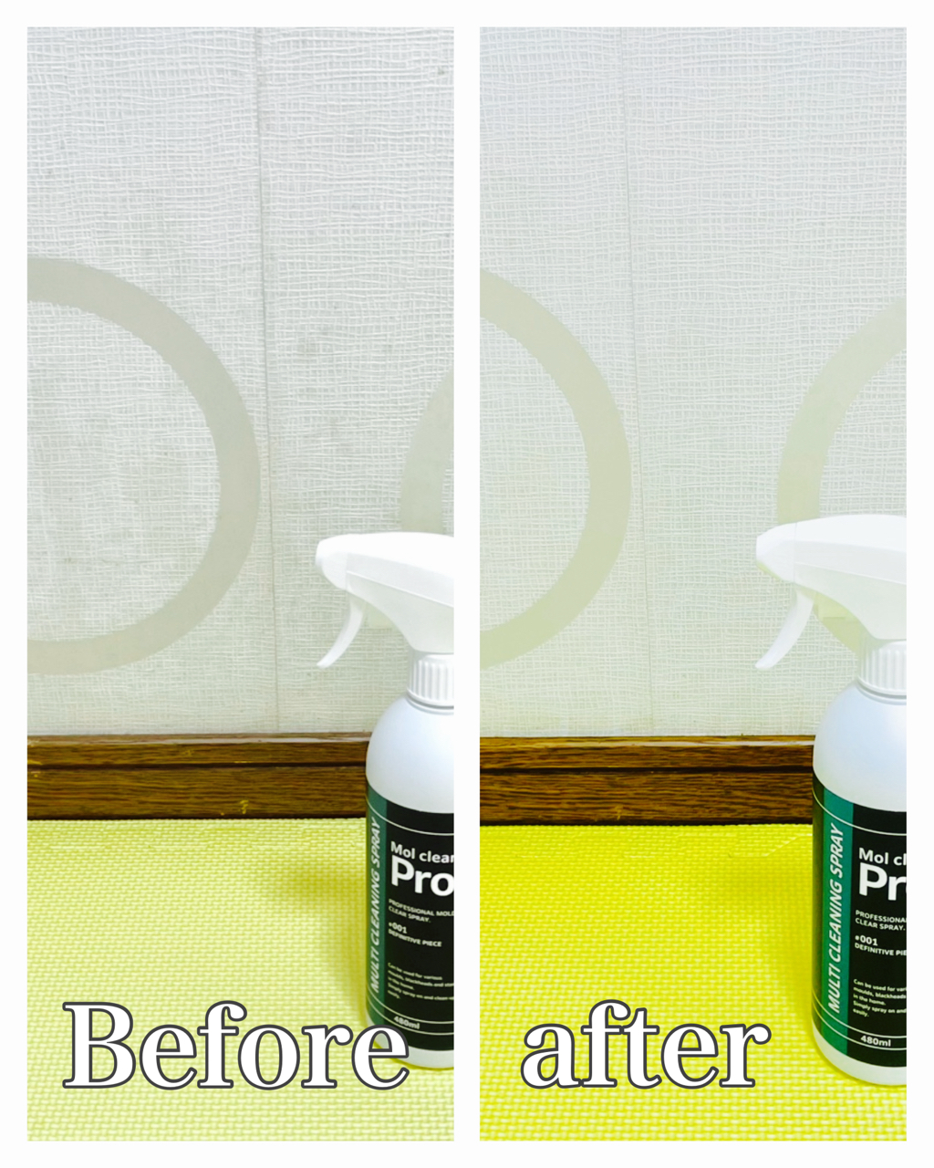 何度か水拭きし、匂いがなくなるまで拭きあげましたが、壁の模様の色が変色しました。