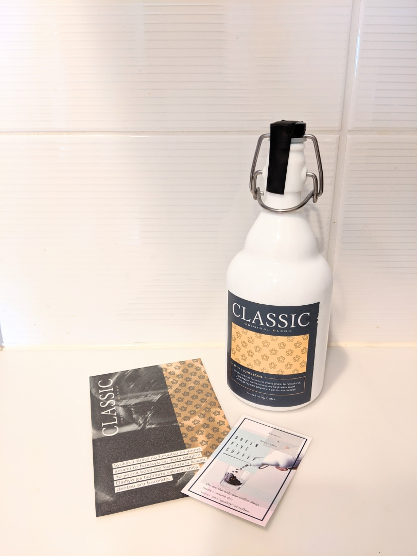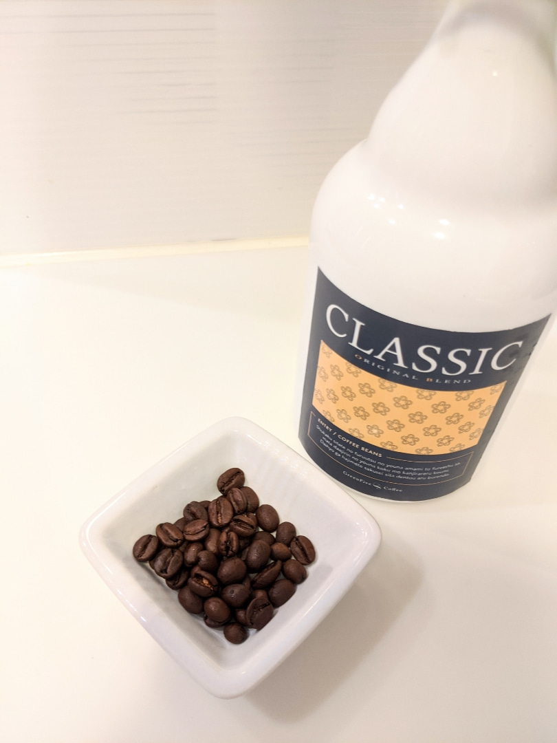 めちゃくちゃおしゃれなガラスのボトルにコーヒー豆が入ってるの!