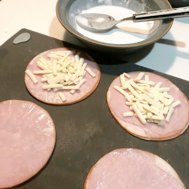 まず、ハムにチーズを挟んで米粉に潜らせ、パン粉をつけます!