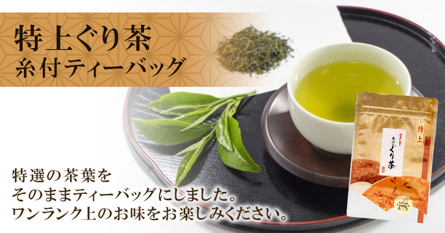 特上ぐり茶糸付ティーバッグ特上ぐり茶糸付ティーバッグ伊豆に香る 市川のぐり茶 当社の特選の茶葉をそのままティーバッグにしました。 糸が付いているのでとても便利です。ワンランク上のお味をお楽しみください。【深蒸し茶】 *湯呑みやカップにフタをして少し蒸していただくと更に美味しくいただけます。 ※パッケージが変わる場合がございます。 内容量:3g×24p4.86 / 41件のレビュー この商品の購入はコチラ