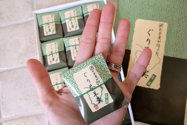 そんな「ぐり茶」の茶葉が入った羊羹。1箱12個入りです。個包装のデザインも、包装紙と同じになってて可愛い♡1つ1つは手のひらサイズ。一度に食べきれる大きさなので、包丁いらずで手軽に準備できます^^
