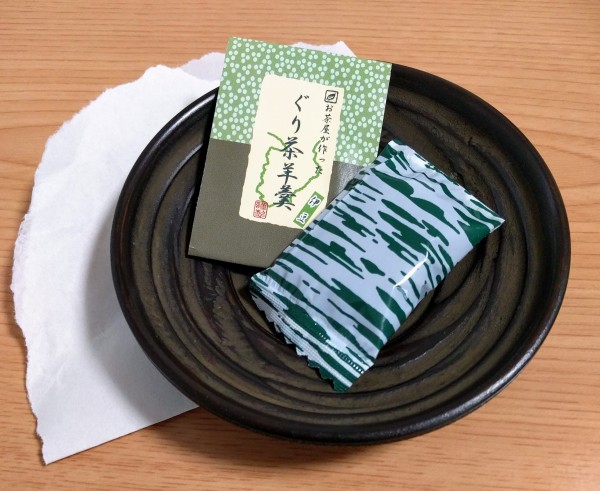 ぐり茶の葉をいれた羊羹を食べてみました。私は名古屋出身なので羊羹は子供のころからよく食べていまし...