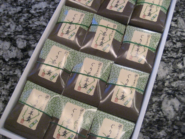 ぐり茶の葉をいれた羊羹を食べてみました。私は名古屋出身なので羊羹は子供のころからよく食べていましたので、