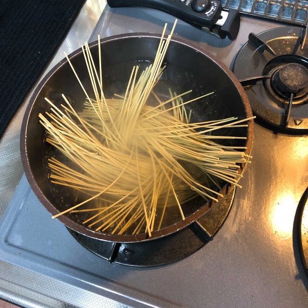 ②沸騰したら、そばを扇状に入れていきます!