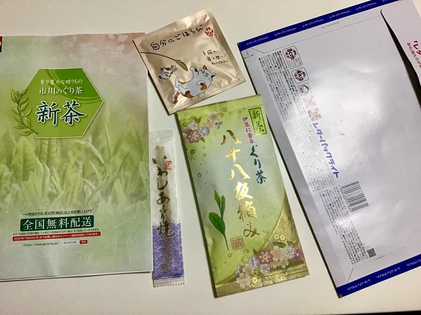 まず、郵送の時点でとても丁寧で、中には商品のぐり茶以外にパンフレット、猫の可愛い絵柄が載っているお茶、お茶請けのいわしあぶり焼きなど、とても素敵なセットをつけてくれていました。