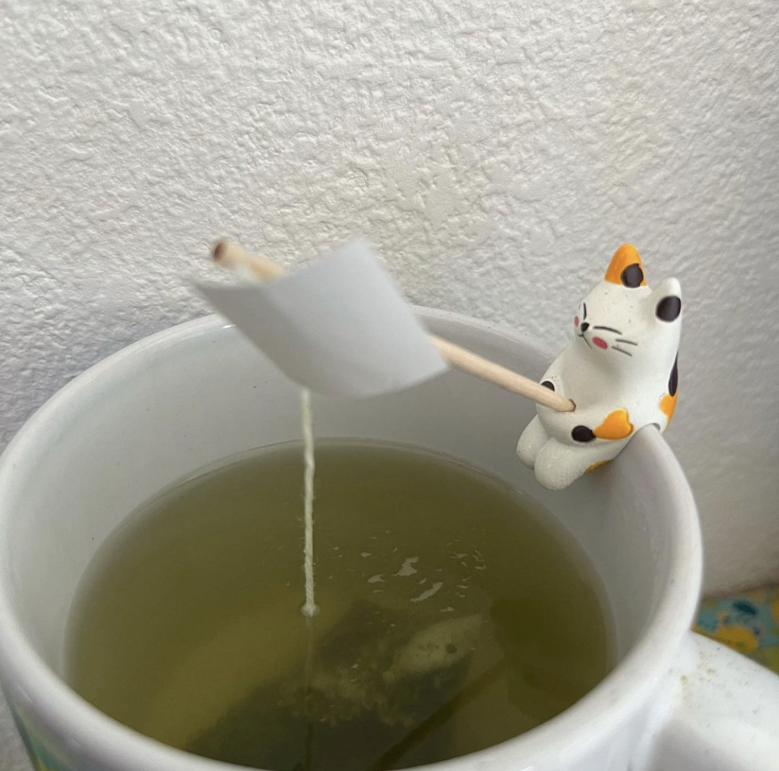 ティーバックタイプのものは、紐を端っこに引っ掛けていても中に落ちたりして、取り出すの大変になることもありますが、これは、付属のみたらしちゃんをコップの縁にかけて爪楊枝を持たせてティーバックをつけるだけで釣りをしている風の可愛い姿が見られます♡