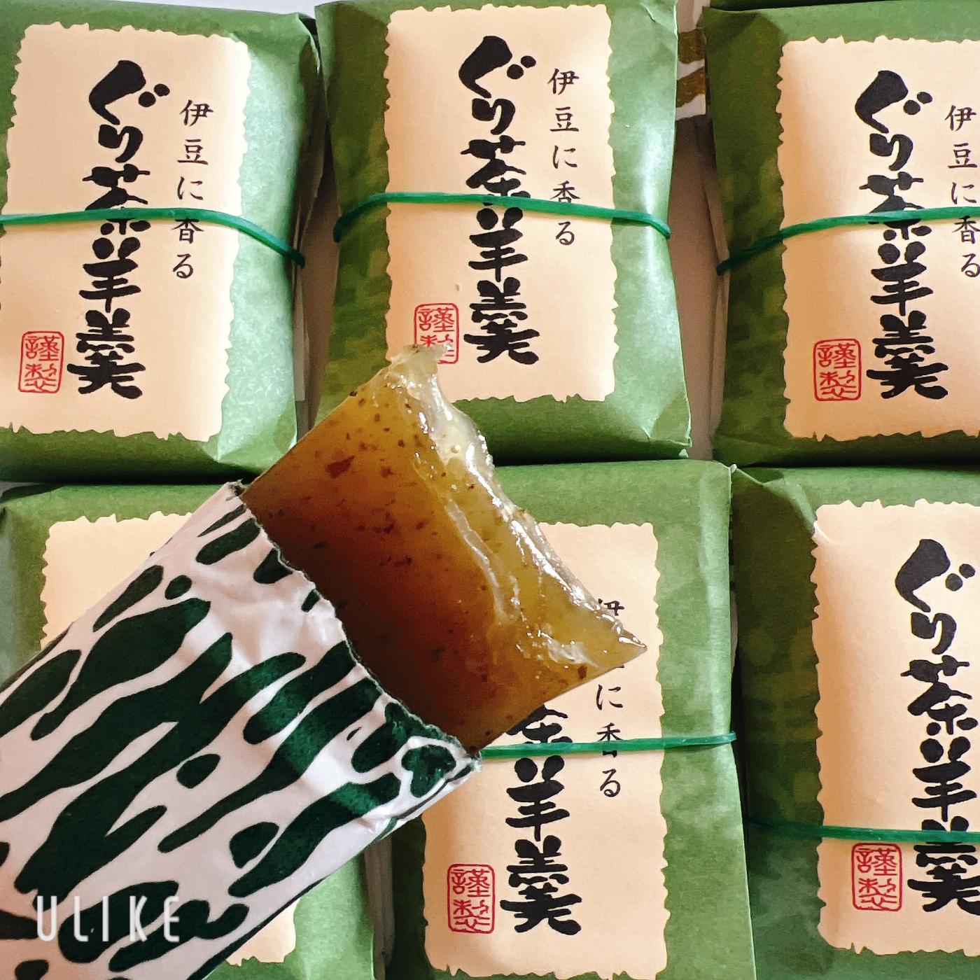 ぐり茶の細かい茶葉を混ぜ合わせた羊羹で、甘さ控えめでぐり茶の風味をしっかり感じられる羊羹♡