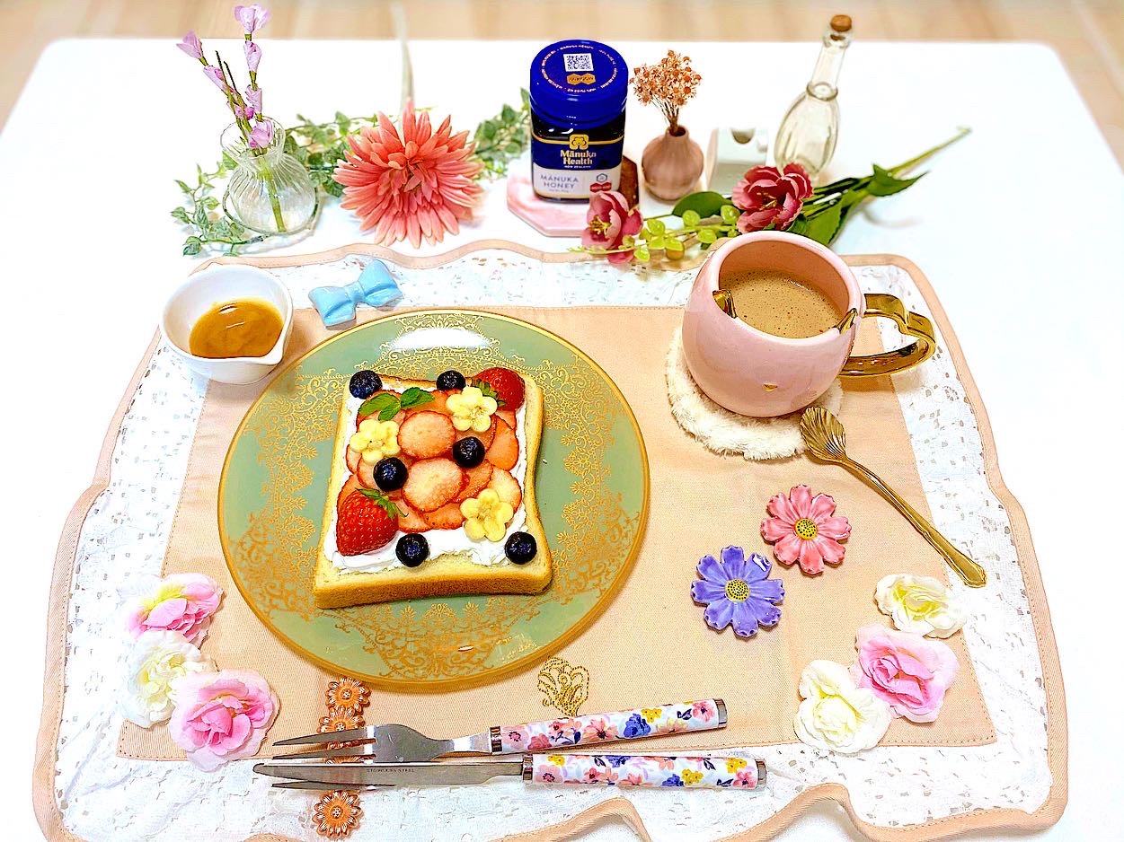 私は今回、いちごのオープンサンドに掛けて頂いたのですが、フルーツの酸味とマヌカハニーの濃厚な甘味がとても良く合います!!